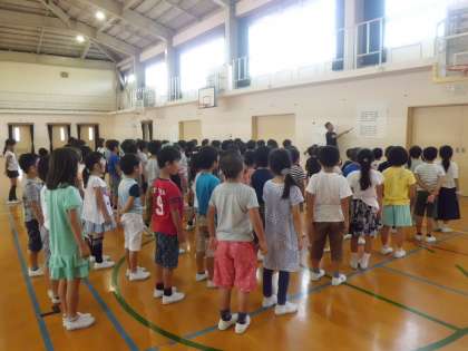 火曜日から本格的に学芸会練習が始まりました。火曜日は学年みんなで集まって学芸会の話を聞いたり,歌の練習をしたりしました。