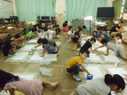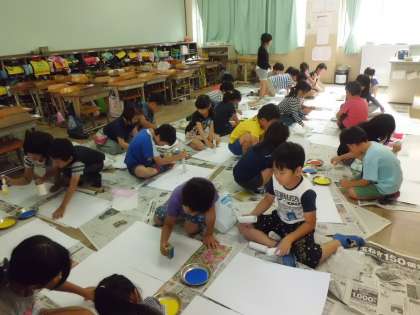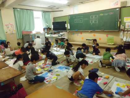 図工では「ころころぺったん」をしました。おうちから持ってきた緩衝材やトイレットペーパーの芯に絵の具を付けて,ころころぺったんしました。友だちの持ってきた材料も使いながら,いろいろな模様を見つけていました。