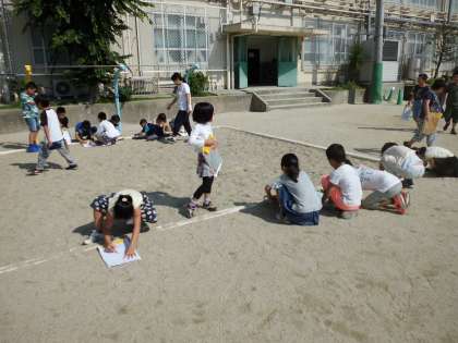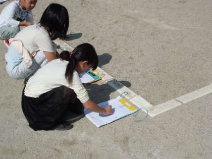 太陽とかげのうごきにはどんな関係があるのだろう。今回は1時間ごとに,かげのでき方を調べることで,太陽がどのように動いているのかを考察しました。時間がたつにつれて,かげのできる位置や長さが変わっていくことにおどろきながら変化を記録していました。