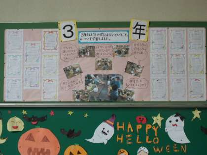人権掲示板には3年生がイヤーマフを使って聞こえないことについての体験学習をした様子が掲示されています。この学習を通して,耳の不自由な方の不便さを知ったり,コミュニケーションを取る方法として口話や手話,筆談などがあることを学んだりしました。自分たちにできることを考えて行動できるといいですね。