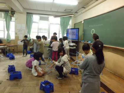 つるが支柱から取れたら,丸い形にして,はりがねで何箇所かとめると,自分だけのリースが出来上がり☆しばらく教室で乾かします。
