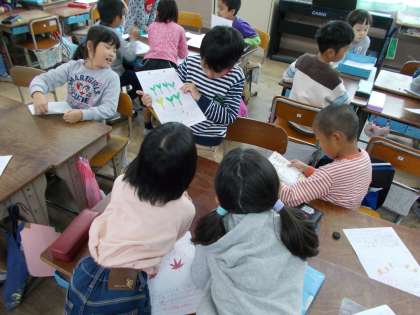 「赤いもみじを見つけたよ。形は星みたいな形だったよ。」