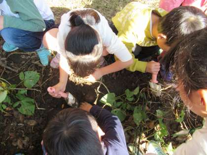 いろいろな大きさや形のサツマイモが土の中から顔を出しました。