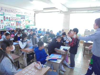 外国語活動の「Lesson4」を学習しました。チャンツを歌ったり,「サイモン・セズ・ゲーム」をしたりしました。サイモン・セズ・ゲームでは,「turn right」「turn lert」など言葉を聞いて,実際に動作をすることを学びました。