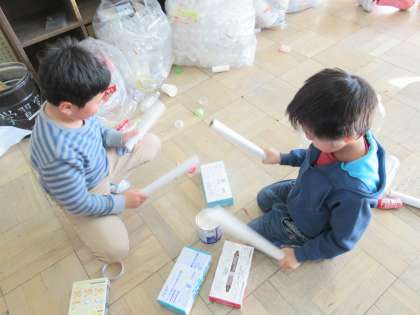 ラップの芯と箱を使って演奏をしてみました。