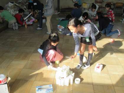 トイレットペーパーの芯を集めて立てたところに,カップを転がしてみました。
