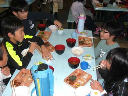 みさきの家1日目の夕食は、お弁当の容器に入ったおかずと温かいご飯・お味噌汁、ゼリーです。おかわりをする子もたくさんいました。