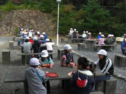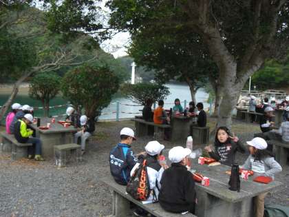 深谷水道の近くの野外テーブルで朝食をいただきました。空にはトンビが2羽、食べ物を物色していました。曇り空ですが、何とか午前中の活動はできそうです。みんな元気です。