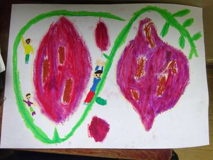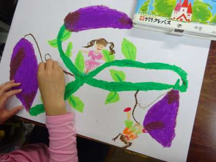 サツマイモやサツマイモのつるで遊んでいたり,食べたりしている人を描いたあと,パスで丁寧に塗りました。子どもたちの想像力は無限大!楽しい作品になってきました。