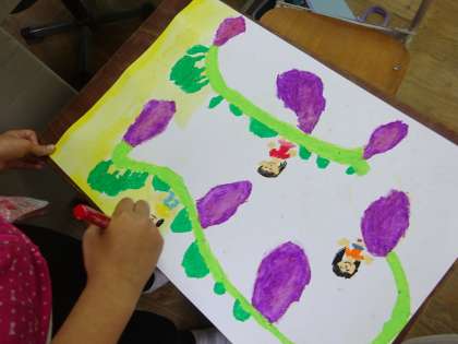 最後に背景を絵の具で塗りました。2年生から始まった絵の具の学習。久しぶりの絵の具の学習だけど,大丈夫かな?ちょっと心配でしたが,水の量を上手に調節して,塗ることができました。みんなで鑑賞の学習をすることが楽しみですね。