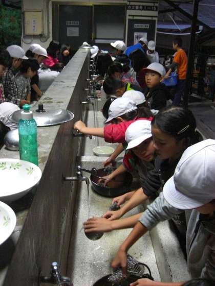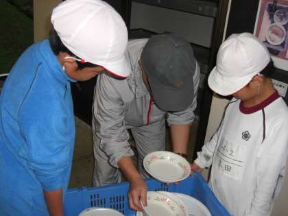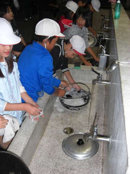 おいしいカレーを食べた後は、しっかりと片付け。洗い物は先生のチェックを受け、オーケーが出るまで協力して丁寧にやり切りました。