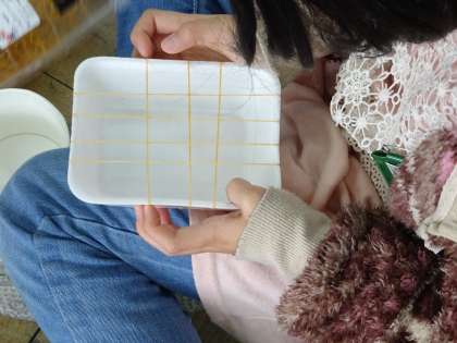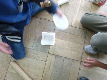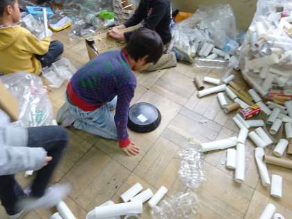 楽器を作って楽しんでる人のほかにも,がらくたを組みあわせて,おもちゃ?のようなものを作って,遊んでいる人もいました。プラスチックの容器に輪ゴムをかけて,コルクを落とすと,トランポリンみたいに跳ねる!カップの中に電池を入れて押すと勝手に動く!様々な発見があったようです。友だちがやっているのをまねしてみて,「すごーい!」と感心している人も。工夫が広がってきていますね♪