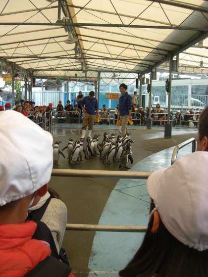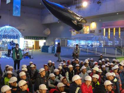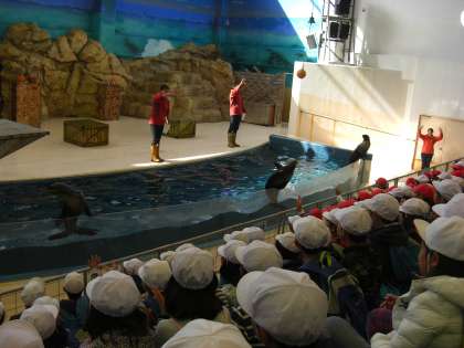 グループごとに館内を見学。アシカショーやペンギンの散歩を見たり,展示を見たりして楽しみました。