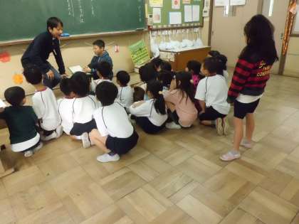 1年生の教室に図書委員さんが,読み聞かせに来てくれました。「ねずみくんのチョッキ」。昔からある名作ですね。