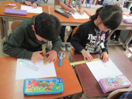 切り込みを2本入れます。切り込みの長さは,センチメートル,切り込みと切り込みの間は,5センチメートルぐらいにします。ものさしで,測ります。