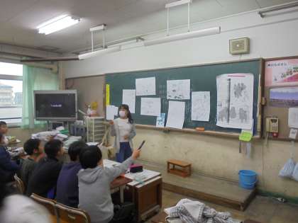 係り活動の時間,みやこキッズで教えてもらった,黒板に貼ってある絵を見て,決められた時間で黒板に貼られた絵を模写をするというゲームをしました。どの班の絵が一番似ている絵なのか,子どもたちは「あれやろ。」「これちゃう。」「先生どれがいいですか?」という感じに,すごく盛り上がり楽しんでいました。