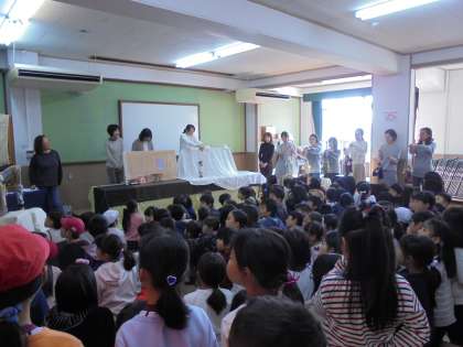 この日を楽しみにしていた児童も多かったようで,100名以上の児童がコミュニティルームに集まりました。セリフや音楽に合わせて動く人形に,またお話の面白さに,子どもたちは吸い込まれているようでした。