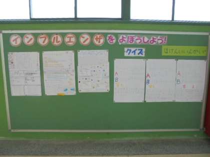 保健委員会では、インフルエンザの予防を呼びかけようと、自分たちでインフルエンザについて調べ、新聞やクイズをつくりました。保健室前に掲示しています。今週インフルエンザでの欠席者は、全校で数名に減っています。しかし、京都市内にはインフルエンザ警報が発令中で、まだまだ油断はできません。ご家庭でも引き続きインフルエンザ予防をよろしくお願いします