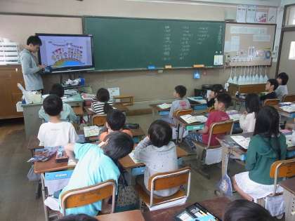 3年2組では,英語の学習をしていました。みんなで,いろんな国の名前を言ったり,その国のあいさつをしてみたりしていました。