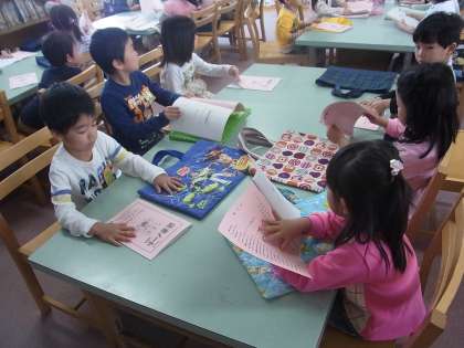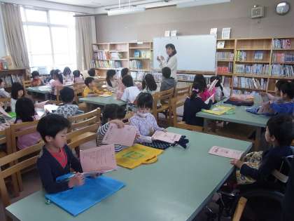 1年1組さんは,学校図書館の新納先生に,読書ノートや図書館の使い方などについて教えてもらいました。これからたくさんの本を読んでいってほしいと思います。