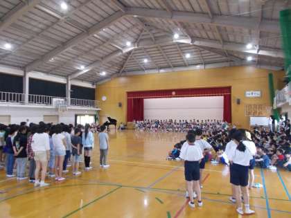 今日の3校時に1年生を迎える会がありました。6年生は,手作りの花メダルを首にかけてあげて,手をつないで体育館へ入場しました。1年生をしっかりエスコートして歩く姿は,やはり最高学年を感じさせるものでした。たて割りグループの1年生とこれからも仲良く,頼られる6年生でいてほしいなと思います。6年生からの出し物(去年の運動会の再現など)もうまくいきました。