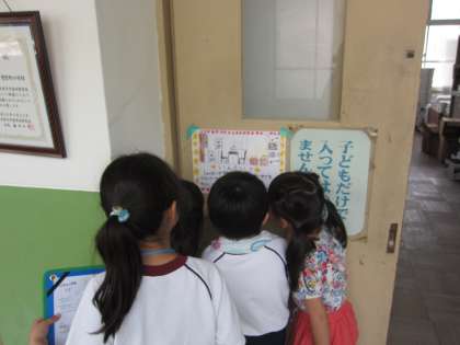 生活科の学習で1年生を学校案内しようということになり,これまで紹介カードを書いたり,自分たちも学校を探検して教室の位置を確かめたりしてきました。