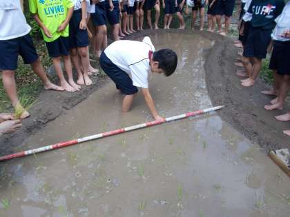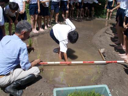 「ときわの米」を植えました。5年生の子どもたちは,田んぼに入り「足が沈む。」「動けない。」「歩けない。」などと,田植えの大変さを感じていましたが,青島さんに教えていただいて,無事に田植えを行うことができました。