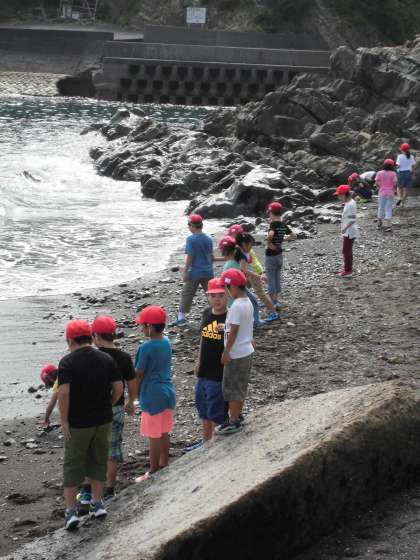 天気予報では、明日は一日中雨とのことなので、浜辺で貝殻やきれいな形の石を拾いました。明日、屋外での活動ができなければ、貝殻や石に文字やイラストをかいて、お土産にする予定です。子どもたちは太平洋が一望できる浜に歓声をあげ、楽しく活動できました。