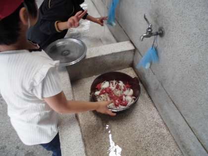 マキで火をおこし、煮立ってきたらルーを入れます。