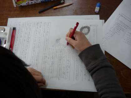 今,国語では【たから物をさがしに】という学習に取り組んでいます。これは,教科書に載っている宝の地図をもとにして,冒険物語を想像を膨らませながら書くというものです。ただ,文章を書くだけではなく,絵を入れたり,最後には厚紙も使って本物の絵本にします。