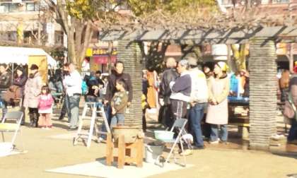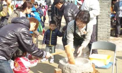 三つのうすで,次から次へともちがつきあげられていました。小さい子どもからお年寄りまで老若男女を問わず,地域のたくさんの人々がもちつきに参加しました。また準備や後片付けには,少年補導委員会常磐野支部をはじめ地域の各種団体の方々のご協力がありました。
