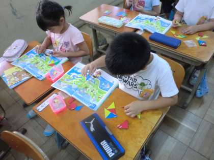 算数「かたちづくり」で色板を操作して形を作っている様子です。