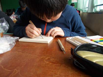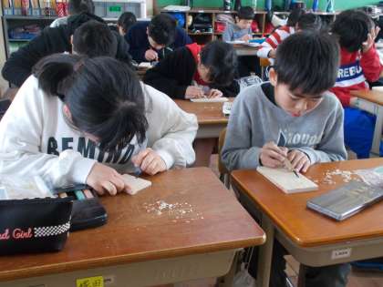 5面にそれぞれの思いをこめた絵や文字を描き,立体感を出すために彫刻刀で彫り進めています。