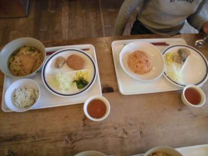 昼食は「うどんと混ぜご飯」か「チキンライス」を選び、おかずはバイキングでした。