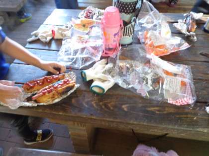 野菜やソーセージをパンにはさんで牛乳パックに入れて