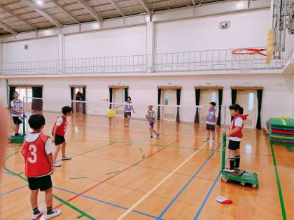体育の時間にはソフトバレーボールをしています。チームで声を掛け合いながら協力して得点を目指します。