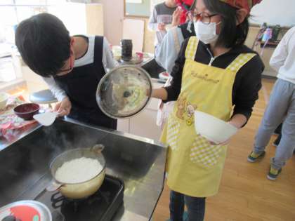 家庭科の学習で,ご飯とみそ汁をつくりました。ご飯は,透明のお鍋で炊いたので,お米が膨らんでいく様子をしっかり観察することができました。みそ汁のおだしも,上手にとれました。みんなよくがんばりました。