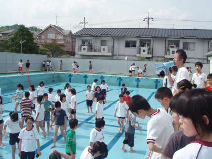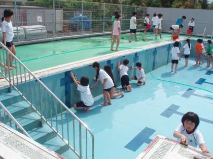 来週から始まる水泳学習のために,今日は高学年の5,6年生がプール掃除をしてくれています。