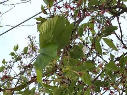 4月(がつ)にさくらの花(はな)が咲(さ)いていましたが,今(いま)はどうなっているか知(し)っていますか?写真(しゃしん)のように,みどりの葉(は)っぱがのびてきています。この葉っぱを使(つか)って,お菓子(かし)を作(つ)ることができます。