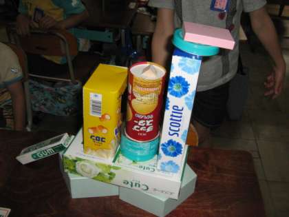 算数の「いろいろなかたち」では、いろんなかたちの箱を持ち寄って、