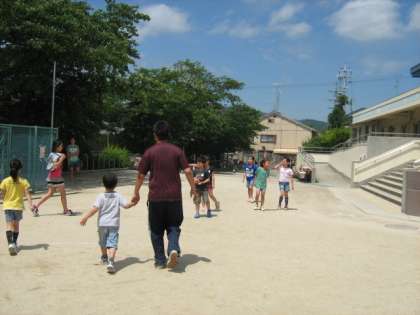 1年生と4人の助っ人のお兄ちゃんお姉ちゃんがおにになって、6年生を追いかけます!!特に何か目印を付けていたわけではなかったのですが、交流をする中で、だいぶ顔も覚えてきた1年生☆