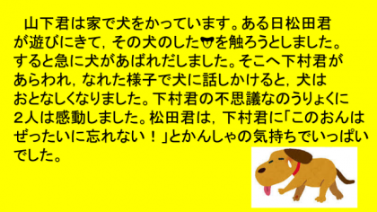 では,先生からチャレンジ問題です!次の文章の中には漢字に直せるものが9つあります。全て5年生で学習した漢字です。全部漢字で書けるかな?
