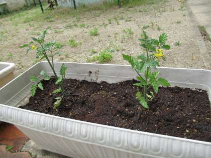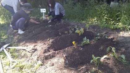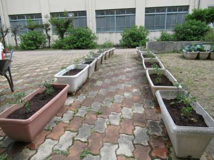真夏(まなつ)の ような あつさの中 先生たちは さつまいもと プチトマトの なえを うえました。みんなが 学校に これるように なったら いっしょに おせわを しましょうね。それまで 先生たちが 水やりや くさひきを がんばります!!