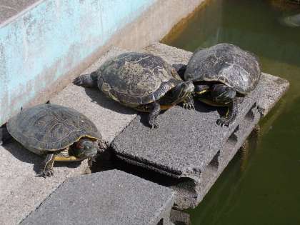 カメさんも あまりに 天気が よいので なかよく 日光(にっこう)よく して いました。なかなか 外にでて おもいっきり あそぶことは できませんが たいようの 光を あびたり 外の 空気を すったりして 気分(きぶん)てんかん するのも だいじですよ。