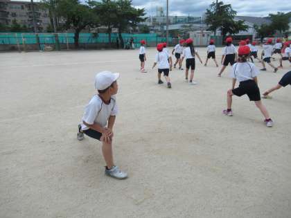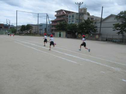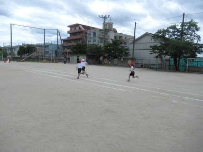 3年生は,みんなで50m走をしてタイムを計りました。元気に体操をした後,力いっぱい走りました。