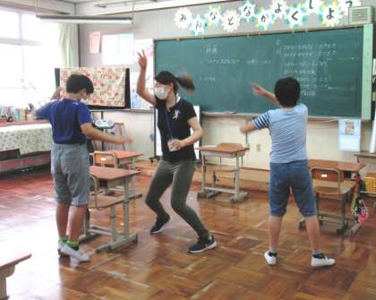 音楽の時間に,音楽のリズムに乗って体を動かしました。「手洗い・うがいをがんばろう」という歌詞もつくりました。いっぱい踊った後は,先生も子どもたちも笑顔いっぱいでした。