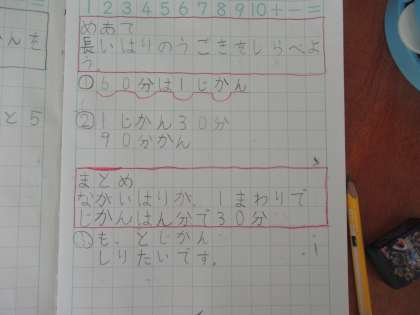 時計の模型を使って,時間の学習をしました。1時間,30分間,それぞれ長い針がどれくらい動くのかを確かめました。とても集中して学習し,ノートに書くときも,ていねいに書くことができました。