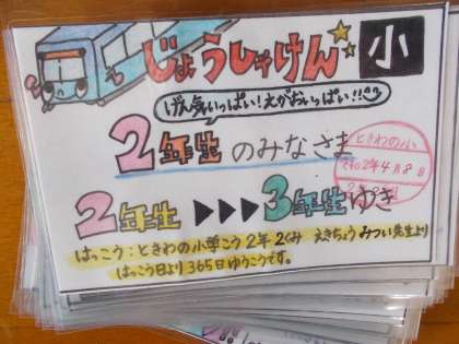 最後に 各クラスで, 2年生から 3年生行きの 「乗車券」を 一人一枚ずつ配布しました。1日1日 3年生に向けて 進んでいるんだという 意識を 常に もって 何事にもチャレンジして ほしいです。1年間 大事に 持っていて ほしいと 思います。