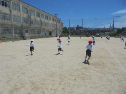 体育の学習では,50m走の準備運動として,おにごっこをしました。子どもたちは広い運動場をかけ回ってとても楽しそうでした。