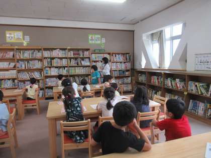 図書館支援員の先生から,図書館のことや本について話を聞きました。たくさんの本がならび,イスと机が新しくなった図書館。わくわくしました。